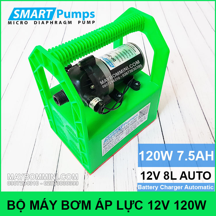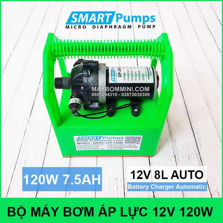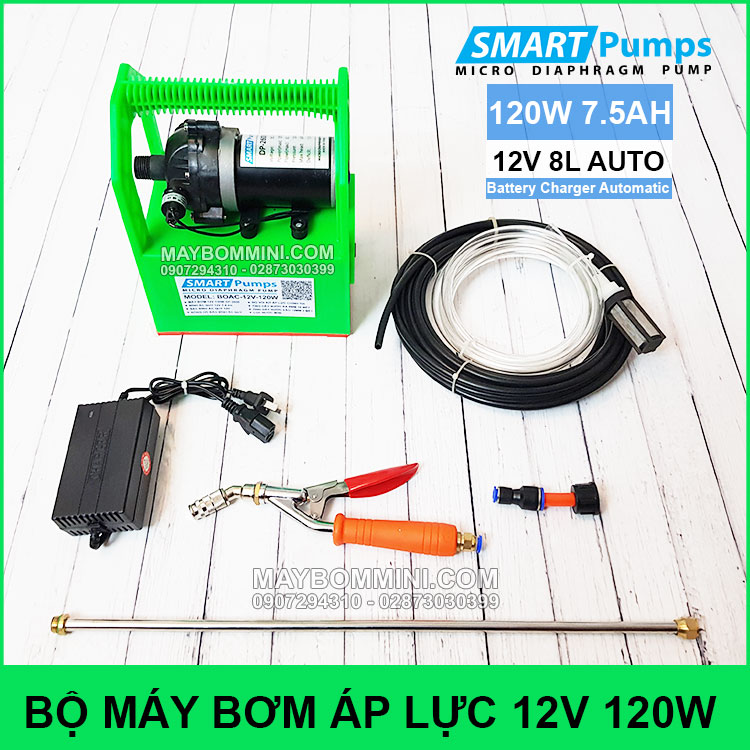 Máy bơm áp lực có trong bộ là loại máy 12V 120W Smartpumps do Maybommini.com phân phối.