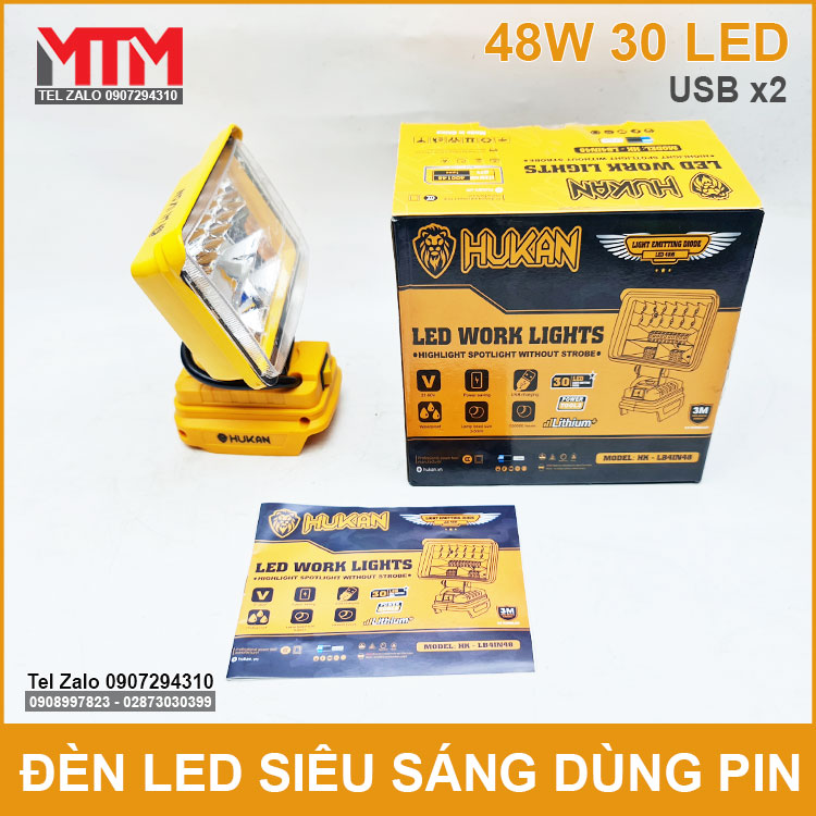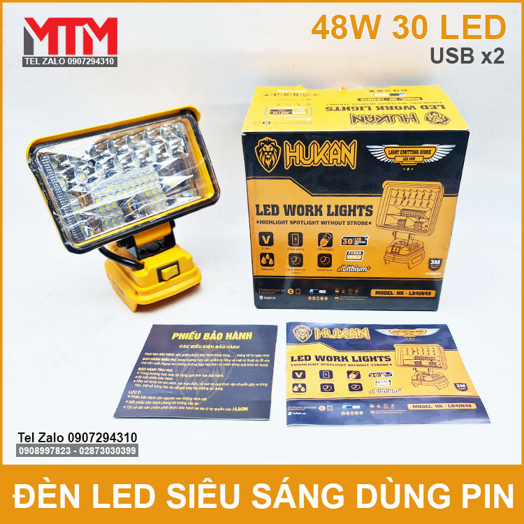 Đèn led siêu sáng dùng pin phổ thông Makita M21 VF 18V 21V 48W Hukan HK-LB4IN48 chính hãng sử dụng khẩn cấp cúp điện, chiếu sáng làm việc. Được thiết kế dùng 30 led siêu sáng công suất tối đa 48W, thân kim loại tàn nhiệt và nhựa ABS có thêm 2 cổng sạc USB.