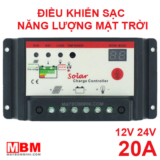 Điều khiển sạc năng lượng mặt trời 12V 24V 20A là mạch điều khiển sạc từ tấm pin năng lượng mặt trời vào bình ác qui và ra hệ thống điện 220V.