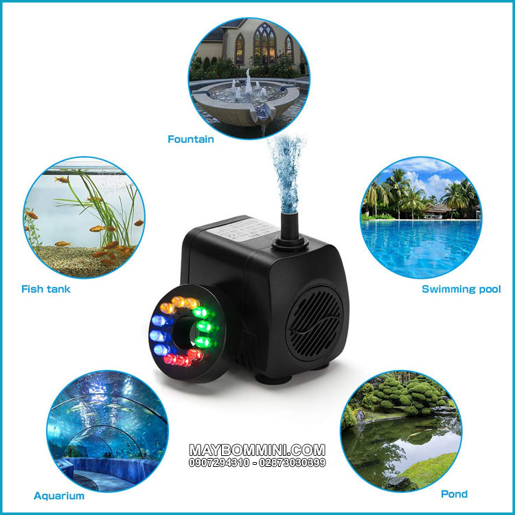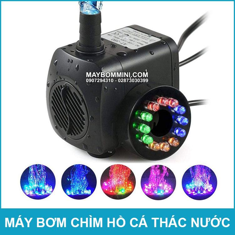 Bán máy bơm chìm hồ cá hòn non bộ thác nước 220V 15W 800L AT-380 LED giá rẻ cao cấp sử dụng phù hợp dùng cho hồ cá, hòn non bộ và thác nước trong nhà gia đình chạy liên tục không chổi than.