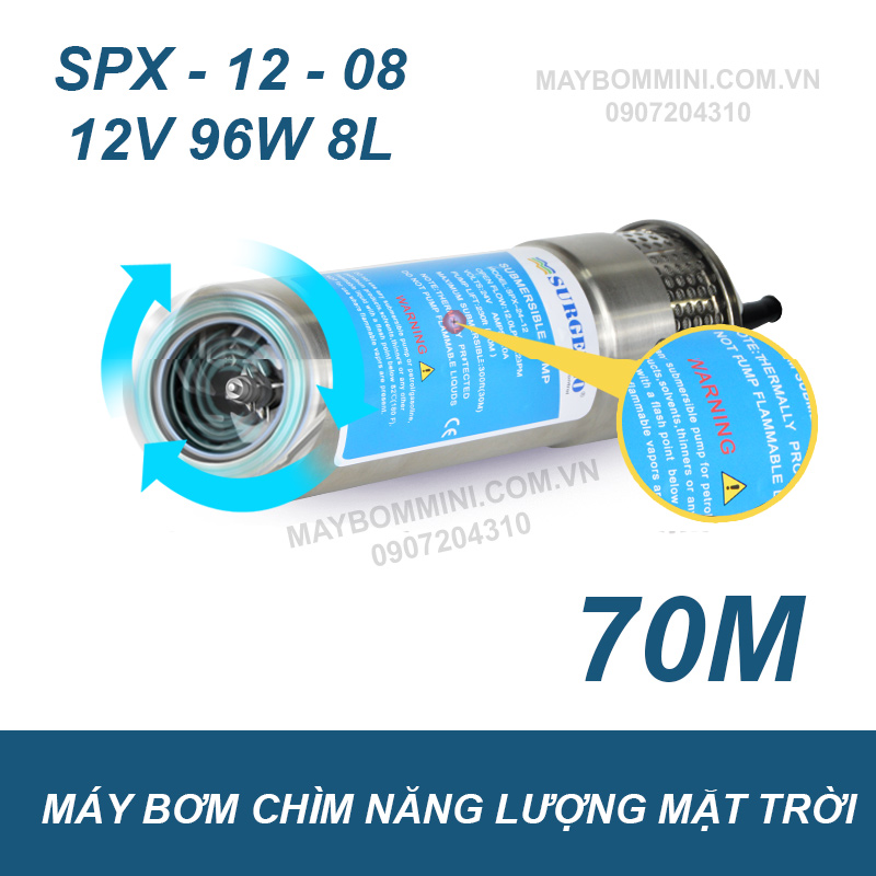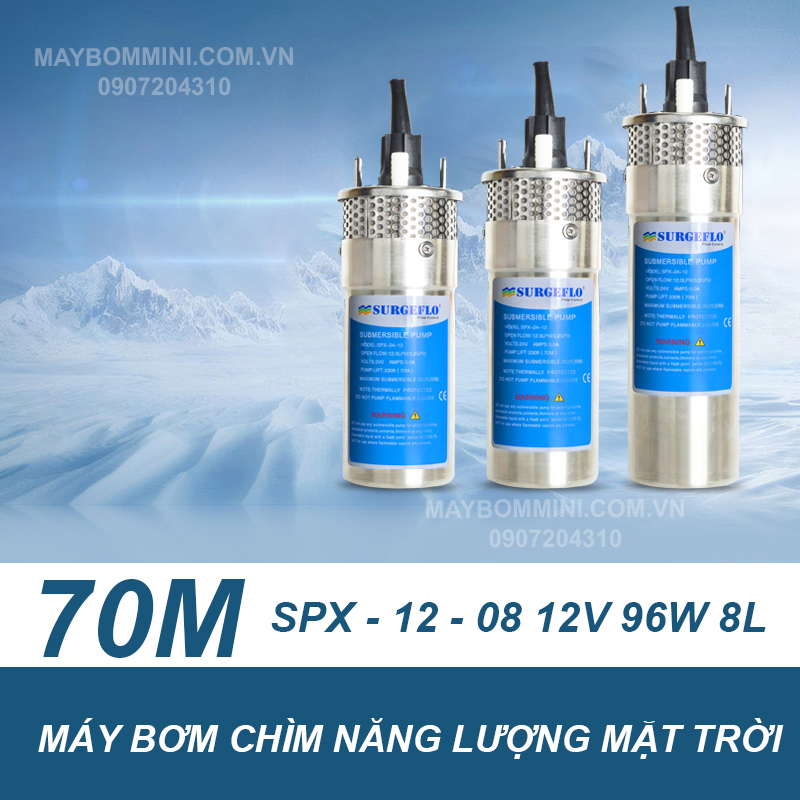 Bán máy bơm chìm SURGEFLO 12V 96W 8L SPX-12-08 đây là loại máy bơm hoạ tiển thường được dùng cho giếng khoan, hệ thống bơm dùng năng lượng mặt trời khá tốt vì dùng nguồn điện 12v mà có thể bơm lên cao 70 mét. Chất liệu inox cao cấp tốn năng lượng ít bảo hành chính hãng giao hàng toàn quốc.