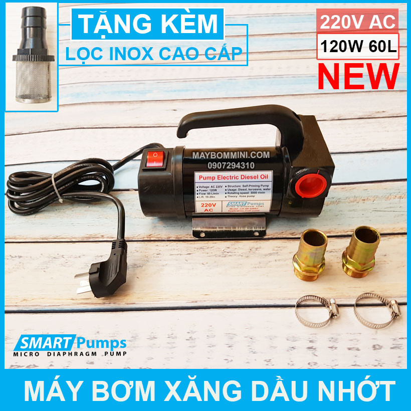 Phân phối sỉ và lẻ máy bơm xăng dầu nhớt 220V 120W 60L SMARTPUMPS chuyên dụng bơm nhiên liệu. Với với công xuất bơm lớn và lưu lượng cao thích hợp bơm nhiên liệu tàu xe phương tiện bơm sang chiết chất lỏng.