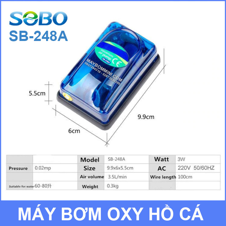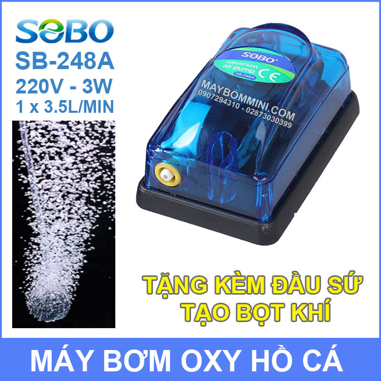 Chuyên phân phối sỉ và lẻ máy bơm oxy hồ cá 220V 3W 3.5L SOBO SB-248A sử dụng công nghệ mới của Nhật Bản nên tiết kiệm điện và tiếng ồn rất thấp. Đây là bơm oxy hồ bể cá trong nhà được ưu chuộng và đánh gia cao từ khách hàng trong và ngoài nước.