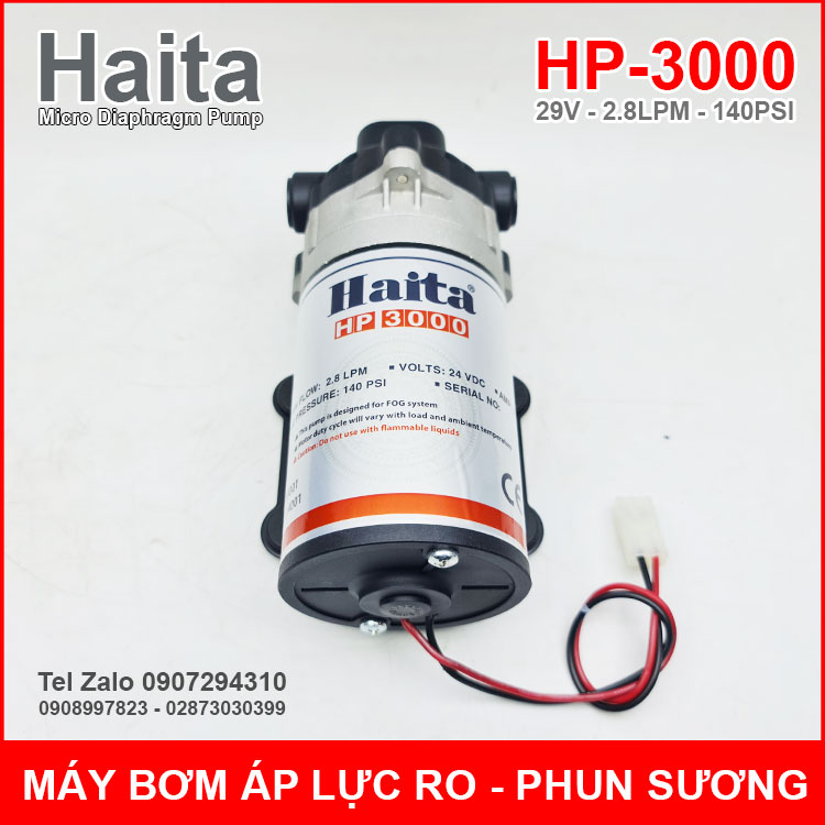 Phân phối máy bơm phun sương lọc nước RO 29V 2.8L 140PSI HP-3000 Haita là loại máy bơm áp lực mini. Máy này hoạt động rất im và không bị nóng khi chạy liên tục thời gian dài sử dụng để phun sương làm mát quán cafe, phun sương nhà hàng, phun sương tưới Lan, phun tưới nhà nấm, rau mầm, nhà yến và bơm tăng áp trợ lực lọc nước RO.