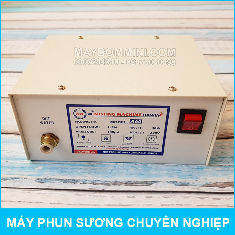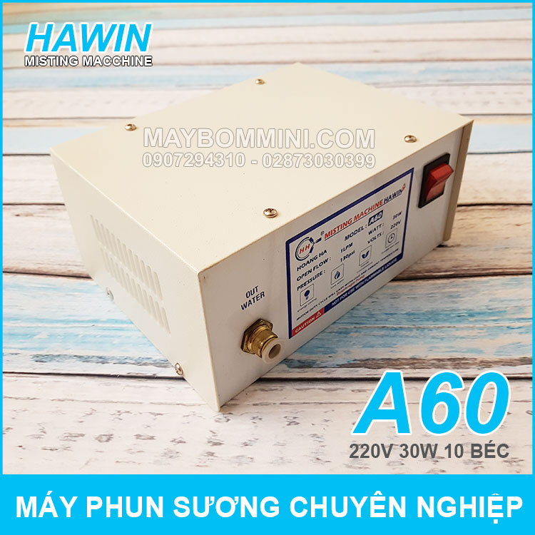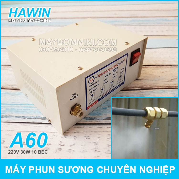 Chuyên phân phối chính hãng máy phun sương chuyên nghiệp 220V 30W 10 béc Hawin A60 giá tốt trên toàn quốc. Máy phun sương A60 thiết kế tích hợp rất tiện khi lắp đặt và sử dụng làm mát tưới cây cho gia đình và các quán cà phê.