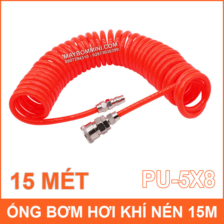 Cung cấp sỉ và lẻ ống dây máy bơm khí nén 15 mét PU-5×8 chất lượng kiểu dây xoắn ruột gà thông dụng. Đây là loại ống có sẵn đầu nối nhanh đực và cái để gắn vào máy bơm và đầu xịt hoặc thiết bị hơi cầm tay.