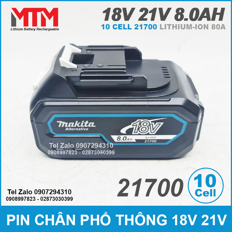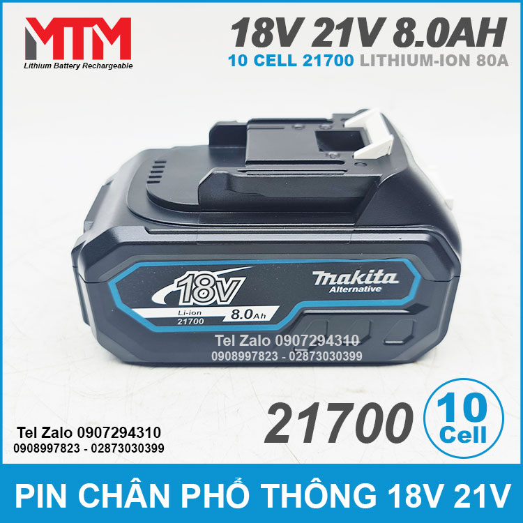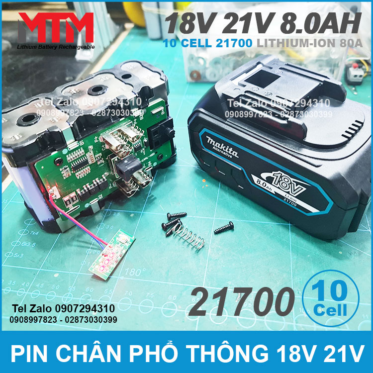 Bán pin chân phổ thông M21 Makita Hukan Dekton 18V 21V 8.0Ah 10 cell 21700 mạch 80A gía tốt giao hàng trên toàn quốc. Pin sử dụng cell 21700 là loại pin Lithium-ion chuyên dụng cho các thiết bị cầm tay tải cao cần dung lượng lớn phổ biến hiện nay có trên thị trường như bắn vịt, bắn bulong, máy khoan, đèn, quạt dùng pin, máy cưa pin ….