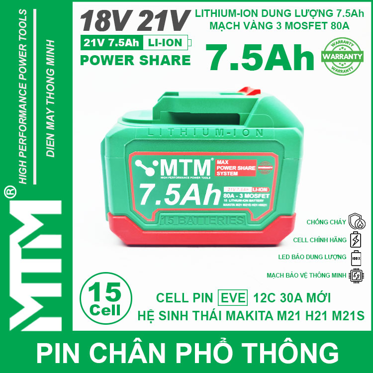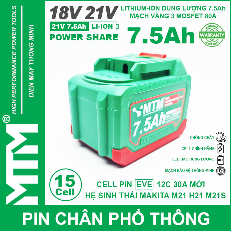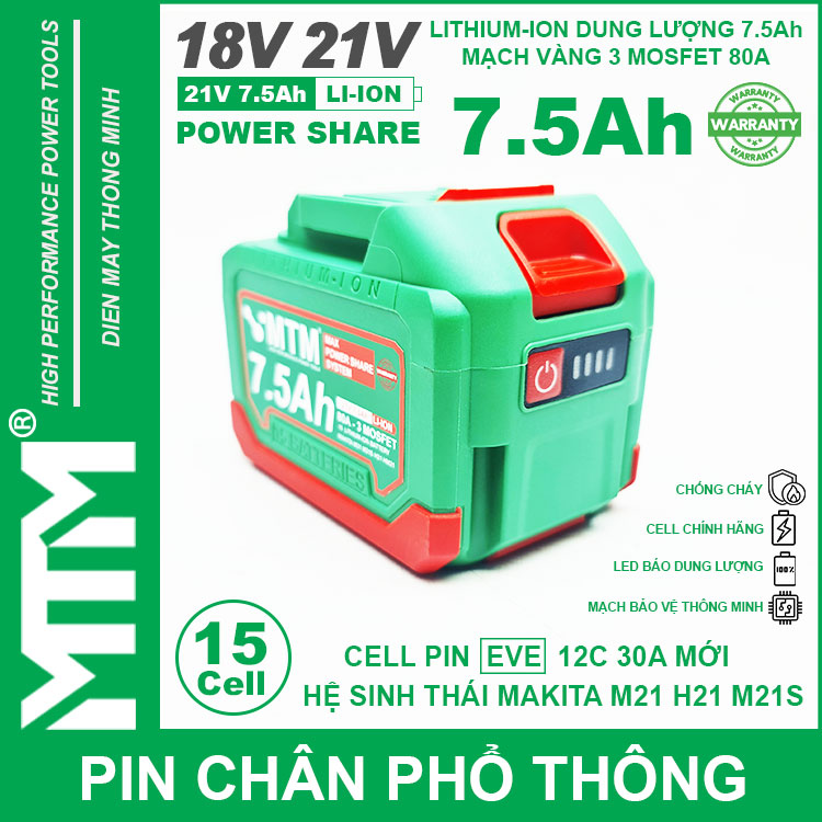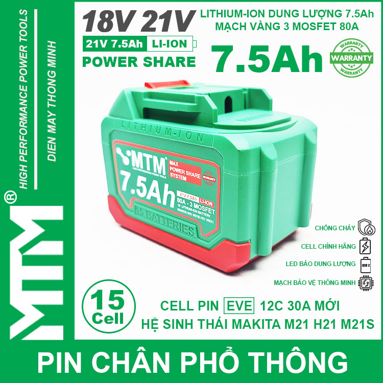 Pin chân phổ thông Makita 18V 21V 7.5Ah 15 cell mạch 80A led báo pin chống sốc cell EVE 25P. Sử dụng cell Lithium-ion 18650 12C 30A EVE chính hãng chuyên dụng cho các thiết bị cầm tay chịu tải lớn dòng xả cao như bắn vịt, bắn bulong, máy khoan đục bê tông, máy mài, đèn, quạt dùng pin, máy thổi hút bụi và nhiều thiết bị cầm tay khác.