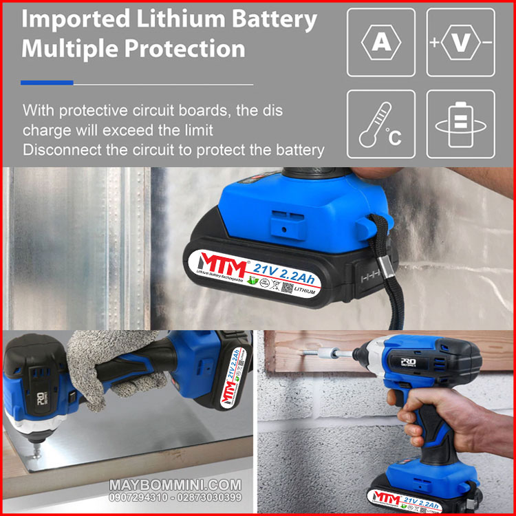 Pin chất lượng cao, hệ thống bảo vệ bảng mạch để tránh tình trạng máy khoan quá sạc bị kẹt hoặc quá tải, tự động ngắt nguồn.